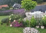Ładnie zagospodarowany ogród z licznymi nasadzeniami: drzewka owocowe, krzewy, kwiaty i byliny.
