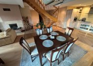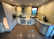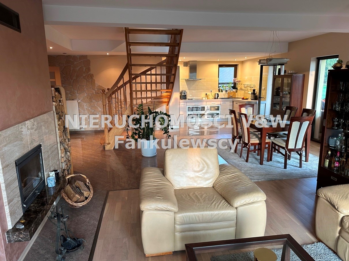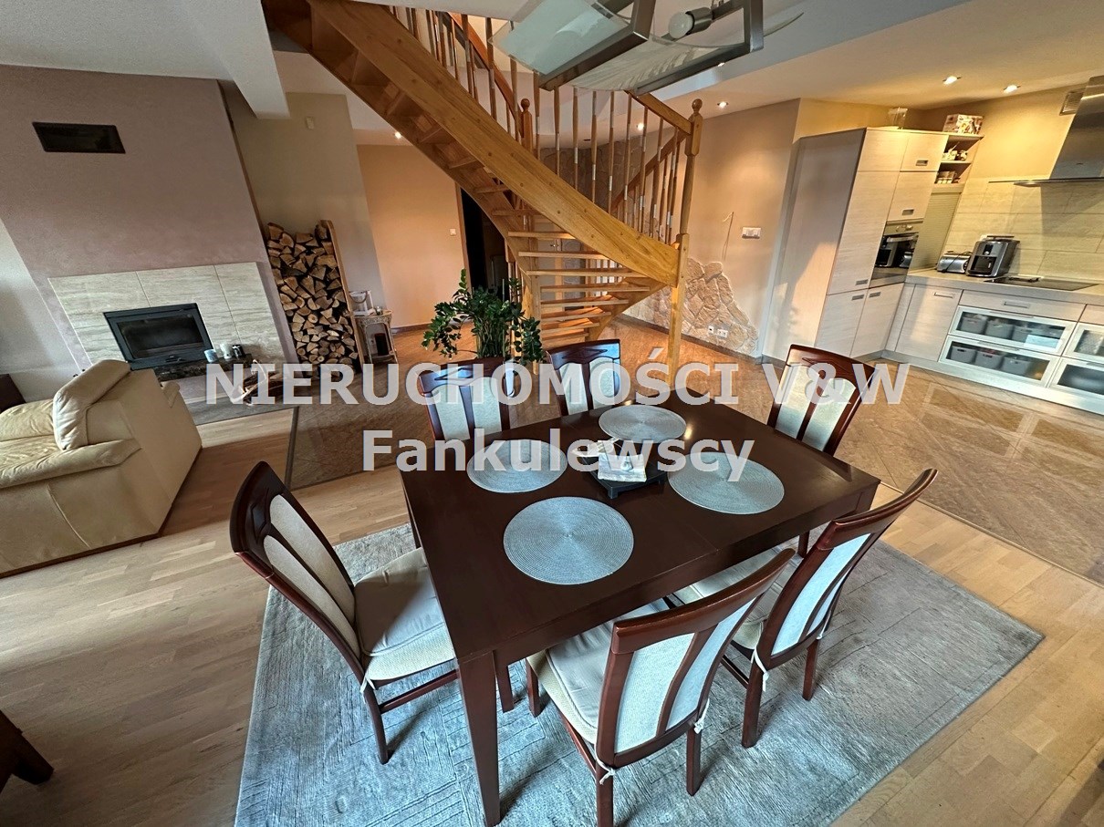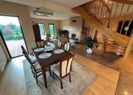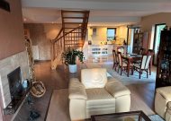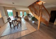 - salon połączony z holem, jadalnią i aneksem kuchennym o powierzchni około 52m2 z kominkiem z rozprowadzeniem ciepła na wszystkie górne pomieszczenia i wyjściem na przestronny taras około 50m2 (na tarasie deska kompozytowa)