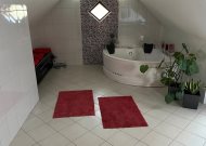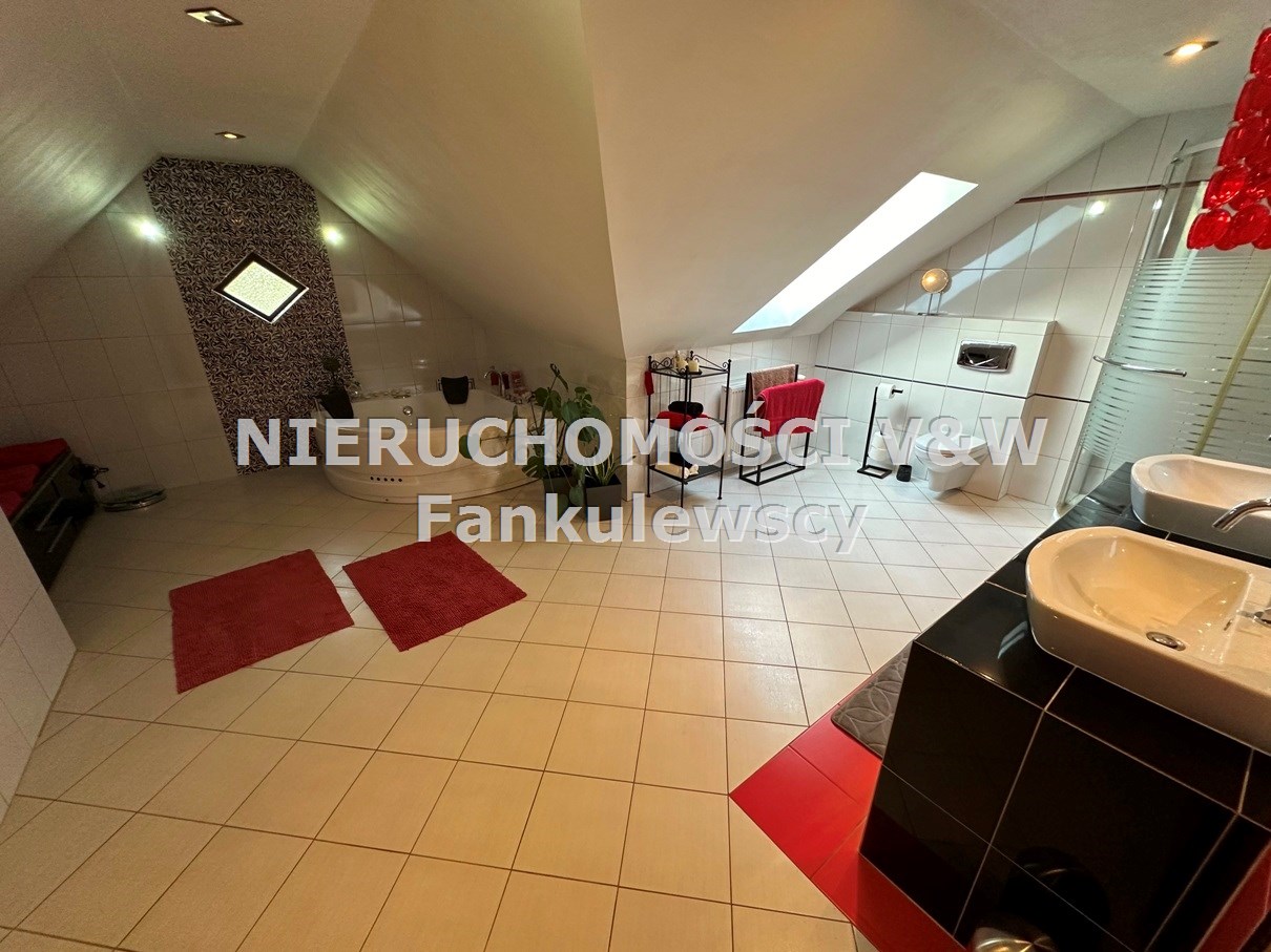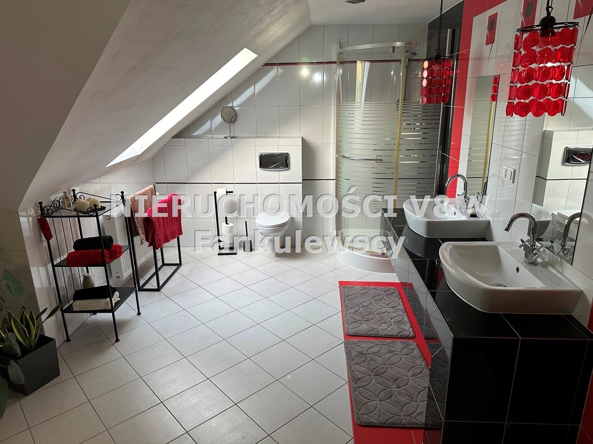- łazienka ze skosami i oknem dachowym z kabiną prysznicową, wanną narożną i dwoma umywalkami